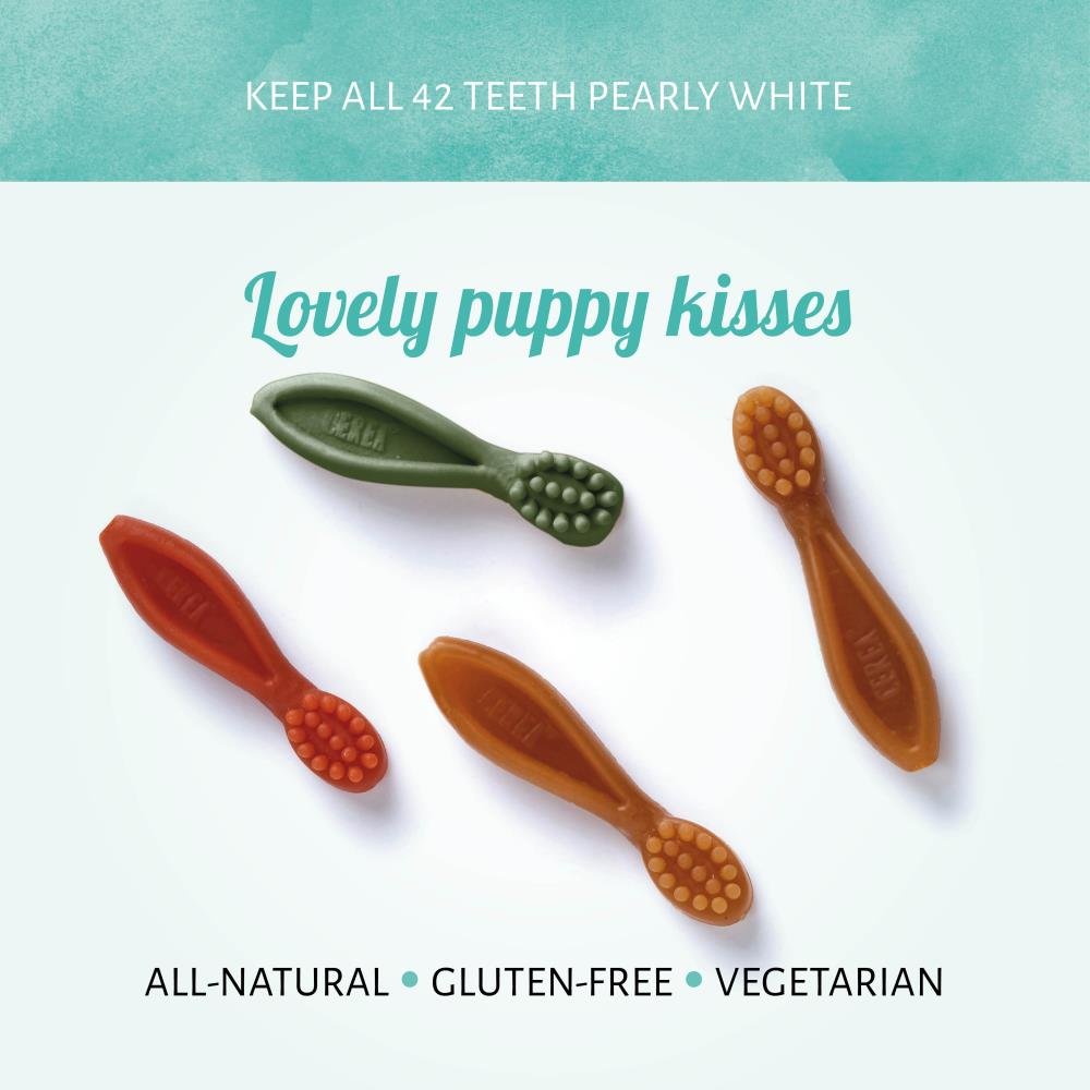 Commençons le brossage ! Plein de délicieuses brosses à dents qui mettent l'eau à la bouche, votre chiot fera tous les tours en un rien de temps avec nos Cerea Brushies Chien. Spécialement confectionné pour les chiots.