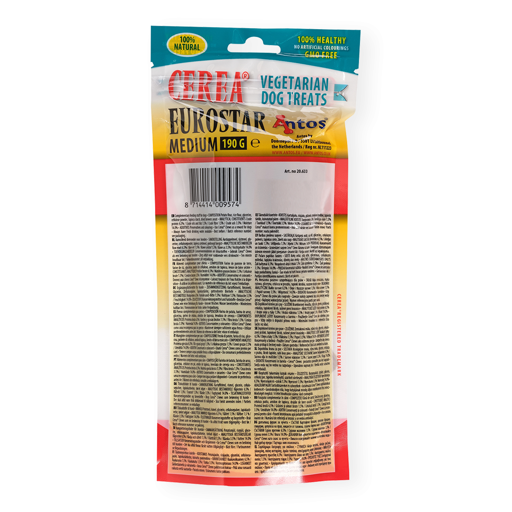Nos Cerea Eurostar sont fabriqués à partir d'ingrédients naturellement sains et ont très bon goût. Ça ne dérangera pas votre ami à quatre pattes de prendre soin de sa santé buccale. Utilisez-les en combinaison avec une routine de brossage ou seuls.