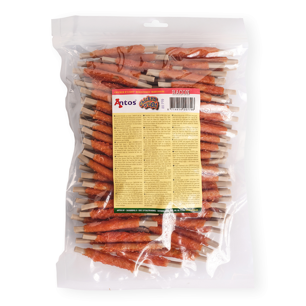 De véritables friandises à base de viande qui donnent à votre chien le goût de dire « Miam ». Chicken D'light Bacon est fabriqué à partir de délicieux poulet enroulé autour d'un bâtonnet de bacon. Votre chien sera ravi de ces délicieuses friandises sans céréales.