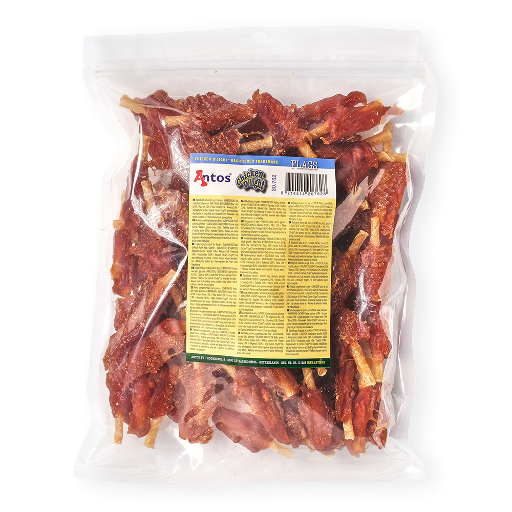 Récompensez votre ami à poils avec les bâtonnets Chicken D'light Flags. Ces friandises à base de poulet et de croûte de cuir sont riches en protéines et apportent satiété et nutriments à chaque bouchée. Vous pouvez vraiment vous sentir heureux de pouvoir gâter votre chien tous les jours.
