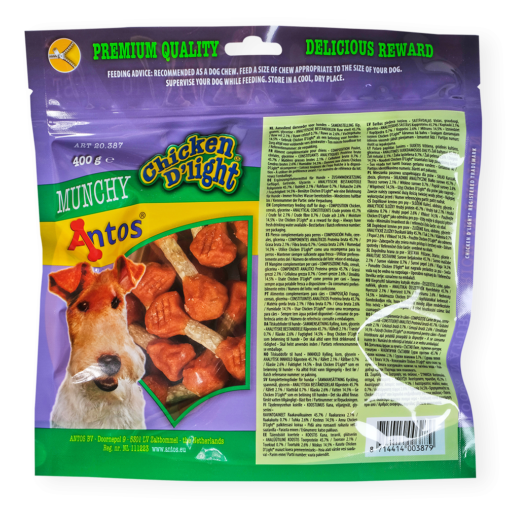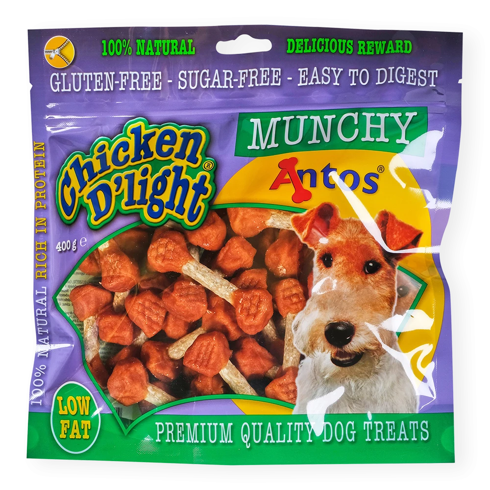 Notre bouchée Chicken D'light Munchy est faite de poitrine de poulet et fera certainement frétiller la queue de vos chiens. Le savoureux poulet est enroulé autour d'un cœur à mâcher, pour créer une friandise parfaite en forme d'haltère.