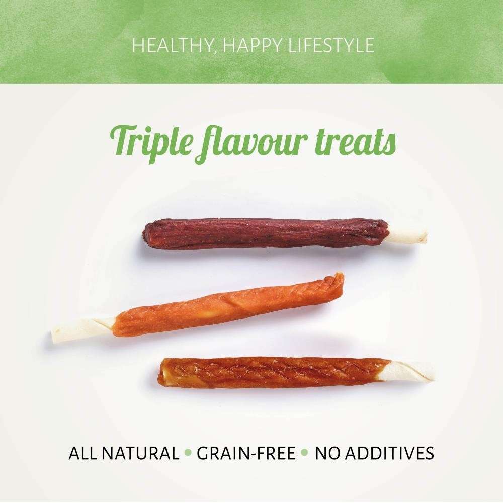 Offrez à votre chien une distraction durable avec les Finest Poultry Bâtonnets. Ces friandises sont faites à base de croute de cuir brut de première qualité, enveloppée d'un délicieux blanc de poulet, de canard savoureux et de foie de poulet. Trois saveurs en une seule bouchée.