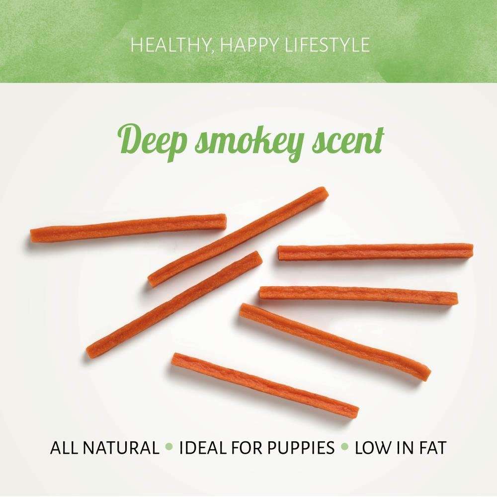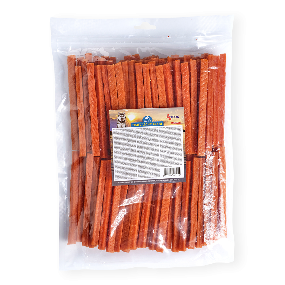 Fish D'light Beams a une délicieuse saveur de poisson. Son parfum fumé et intense fera frétiller la queue de ton compagnon à quatre pattes. Il est plein d’oméga-3 pour une peau saine et un pelage brillant et constitue une excellente source de protéines. Ces véritables friandises au saumon ont un goût savoureux qui fait envie et constituent un choix de friandises judicieux pour ton compagnon à quatre pattes.
