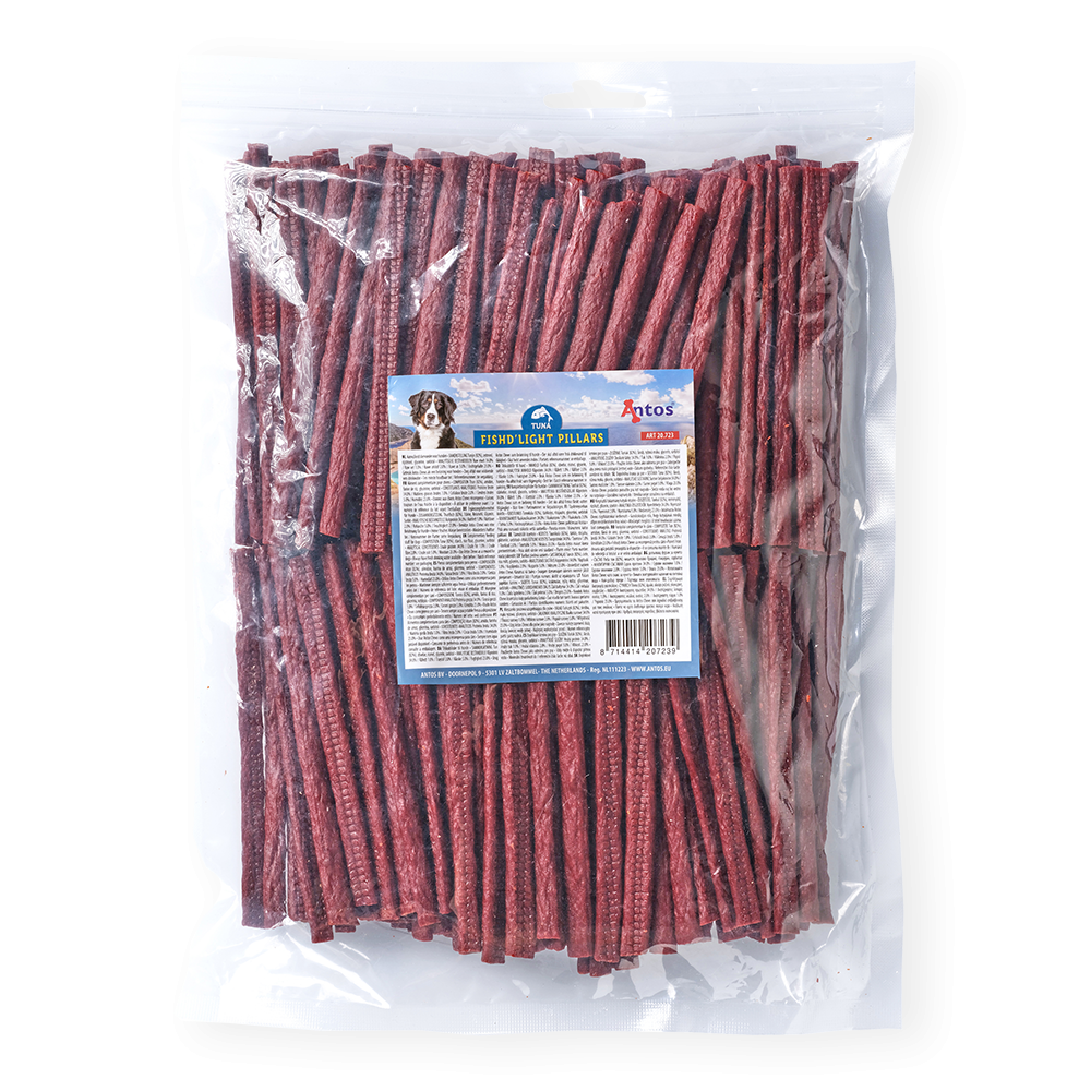 Les Fish D'light Pillars offrent une saveur exceptionnelle à votre chien. Ces délicieuses friandises sont fabriquées avec un nombre limité d'ingrédients pour satisfaire les estomacs les plus sensibles. Du vrai thon, oui. Digestion validée. Taille validée. L'odeur et le goût sont des atouts pour les chiens.