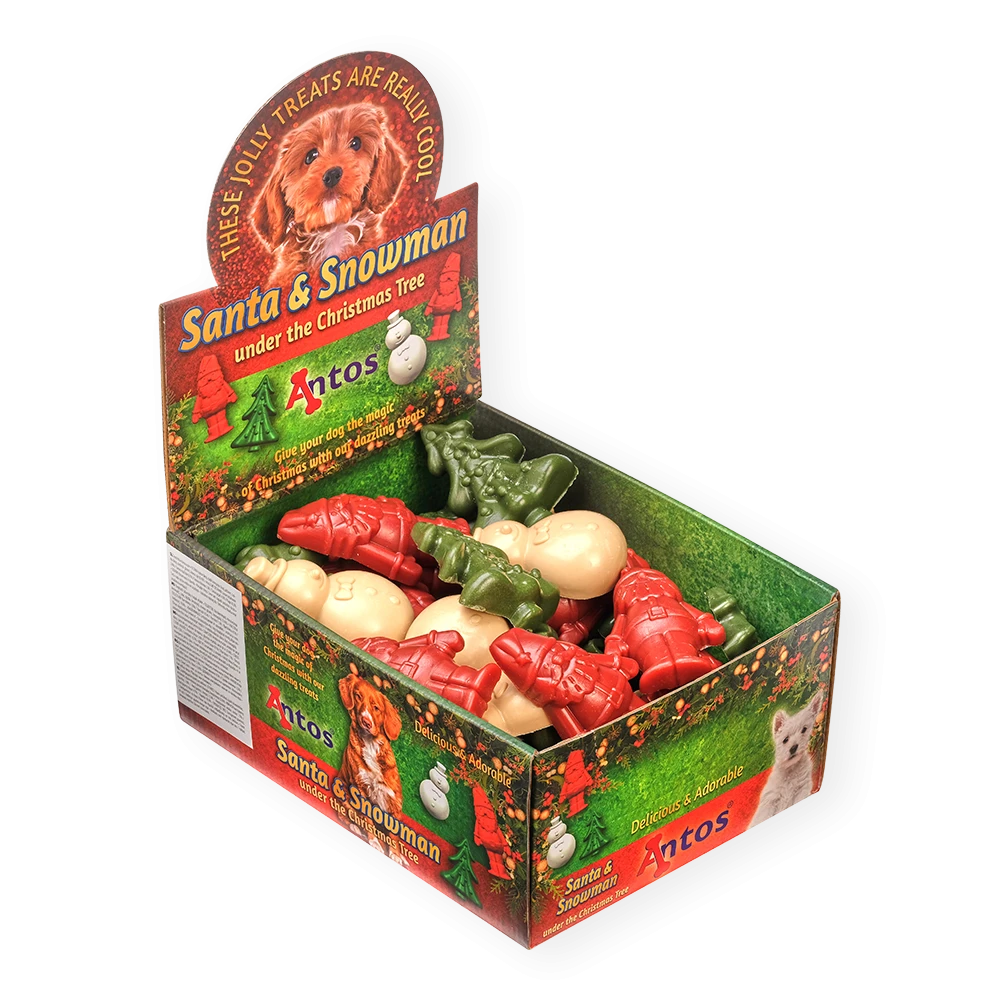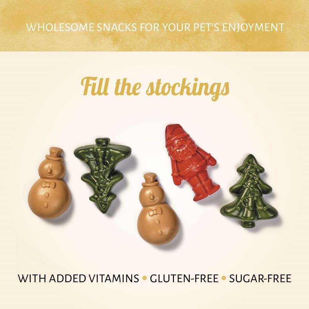 Noël est magique... Santa & Snowman, un trio doux et joyeux. Ces petites friandises dentaires pour chien à la recette végétarienne sont le cadeau parfait à glisser dans les bas de votre ami à quatre pattes. Une délicieuse friandise sucrée pour la période de Noël.