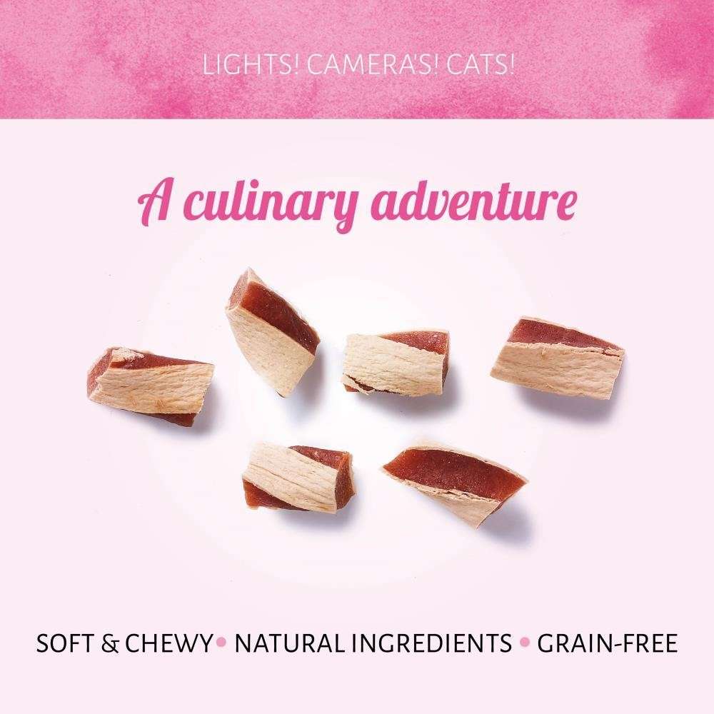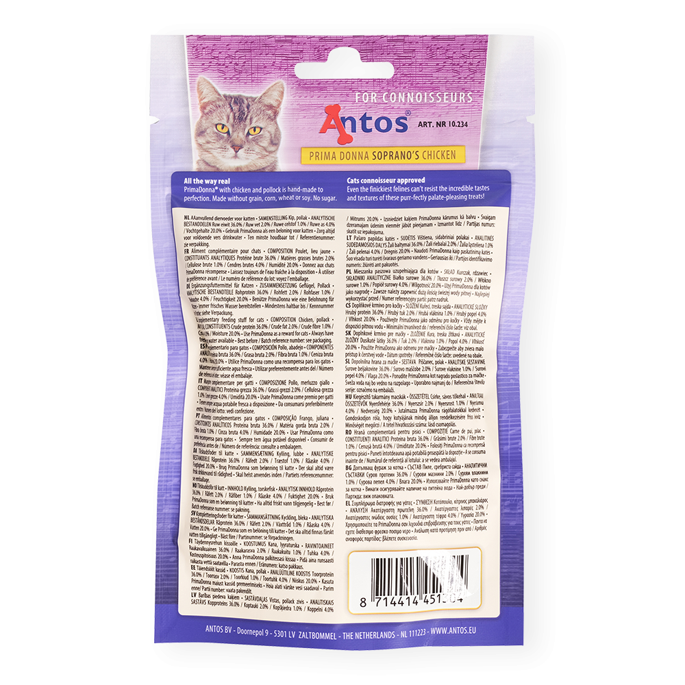 Votre chat si cool dressera ses moustaches à chaque fois que vous ouvrirez un nouveau sac de PrimaDonna Soprano's. Ces friandises tendres et à mastiquer sont à base de poulet et de lieu noir et ne contiennent pas d'additif.